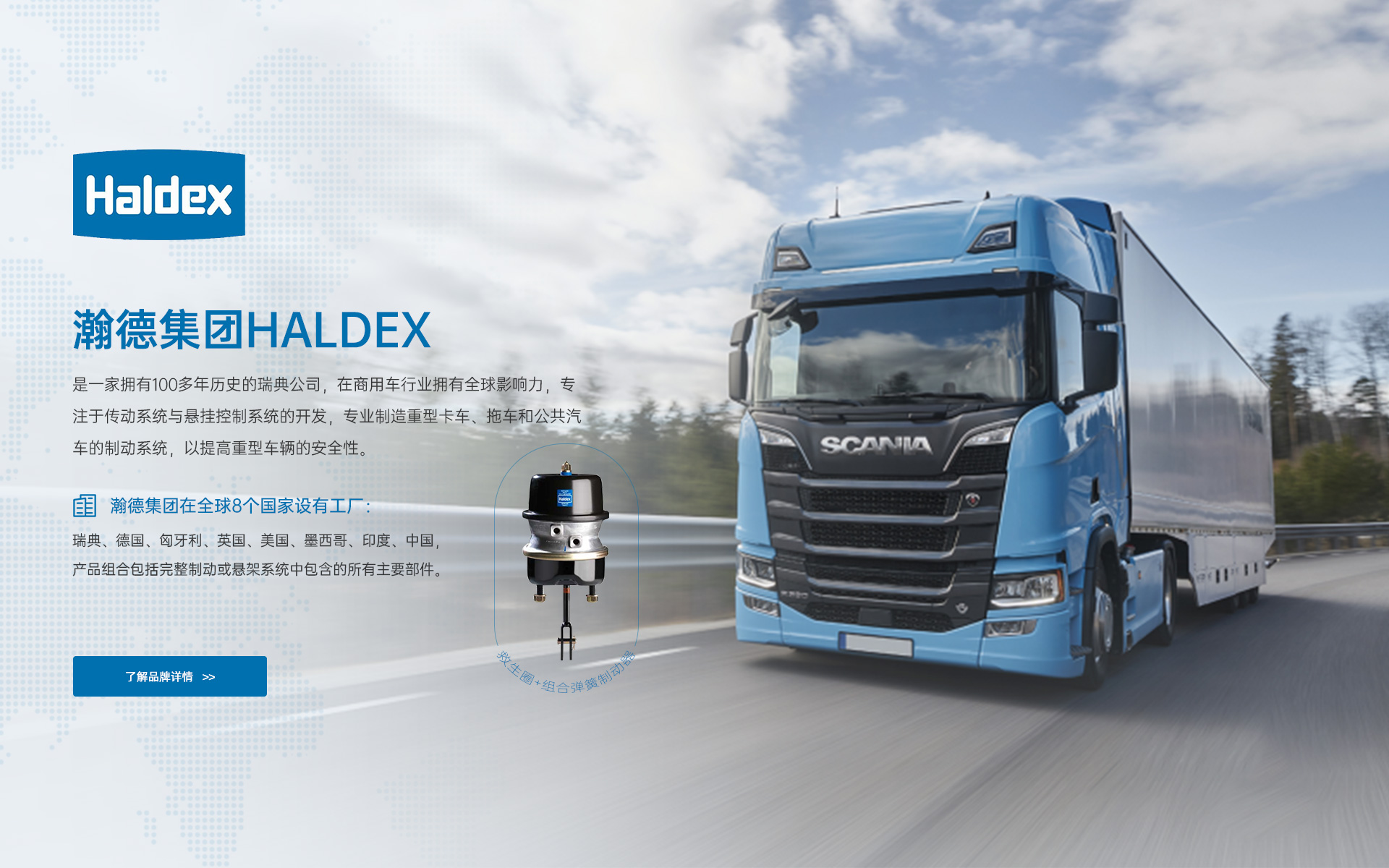 • 瀚德集團Haldex 是一家擁有100多年歷史的瑞典公司,在商用車行業擁有全球影響力,專注于傳動系統與懸掛控制系統的開發,專業制造重型卡車、拖車和公共汽車的制動系統,以提高重型車輛的安全性。瀚德集團在全球8個國家設有工廠:瑞典、德國、匈牙利、英國、美國、墨西哥、印度、中國,產品組合包括完整制動或懸架系統中包含的所有主要部件。